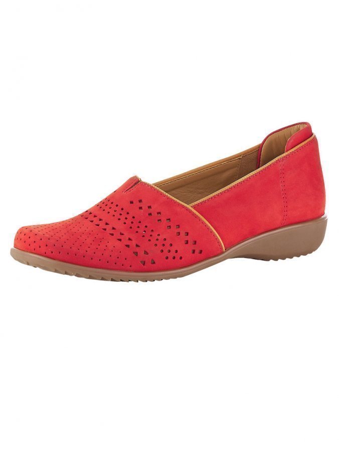 Tyylikkäät ara-kengät. Laadukasta nahkaa. Kesäinen rei’itys. Nahkavuori ja irrotettava nahkasisäpohja (paksuus edessä 2,5 mm, takana 2,5 mm). Kenkiin voidaan vaihtaa irtopohjalliset. Taipuisa ja pitävä ilmatyynyulkopohja, jossa 25 mm:n kanta. Lestin leveys H.