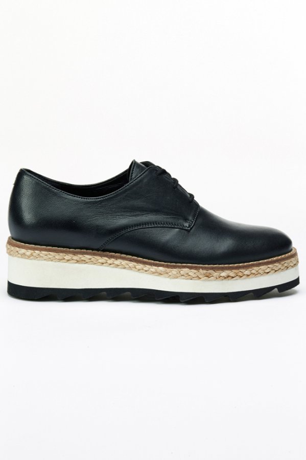Matalat kengät, joissa nyöritys. Huomiota herättävä pohja: ylhäällä punottu narupäällysteinen reuna, jonka alla kevyt, vaimentava valkoinen välipohja sekä musta, karkeakuvioinen ulkopohja. Klassiset sileät kengät saavat näyttävää asennetta. Leveä tikkaus pohjan reunassa. Kapeat, pyöreät nyörit kulkevat raakareikien läpi. Pyöristetty kärki. Päällinen: nahkaa Vuori: tekonahkaa Sisäpohja: tekonahkaa Välipohja: tekokumia Ulkopohja: tekokumia Koron korkeus: n. 4,5 cm Korokepohja edessä: n. 3 cm