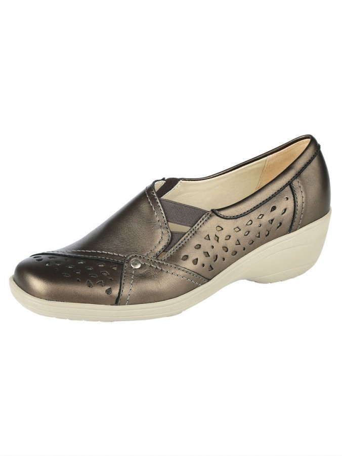Helmiäishohtoisesta nahasta valmistetut kengät, joissa on sivuilla venykkeet. Miellyttävä nahkavuori. Irrotettava sisäpohja on pehmeää tekokuitua. Erittäin taipuisa ulkopohja, jossa on 40 mm:n kanta. Lestin leveys H.