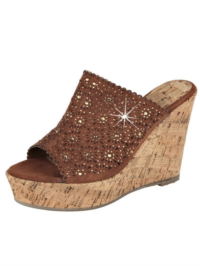 Liva Loop -kiilasandaalit, valmistettu veluurimateriaalista. Jalkapöydän päälle asettuvassa remmissa koristekiviä sekä ornamenttikuvioista rei´itystä. Miellyttävä sisäpohja. Päällystetty 35 mm:n korokepohja sekä 100 mm:n kiilakorko. Lestin leveys G.