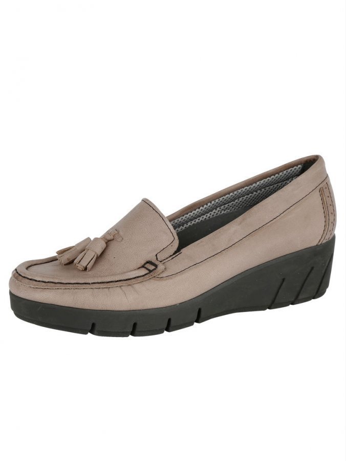 Kiilakannalliset loaferit, jotka on somistettu tyylikkäällä tupsulla. Nappanahkaisissa loafereissa on mukava vuori ja pehmustettu, irrotettava nahkasisäpohja. Voidaan käyttää irtopohjallisten kanssa (paksuus n. 3 mm, takana 5 mm). Erittäin taipuisa ulkopohja, jossa on 45 mm:n kiilakanta. Lestin leveys G.