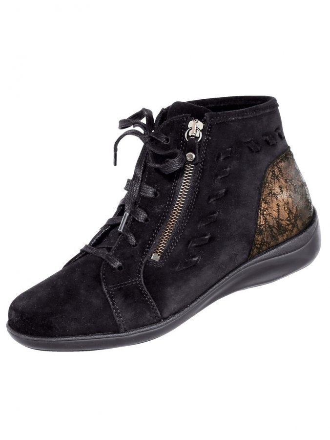 Naudannahasta valmistetuissa naturläufer-nauhakengissä on tehostevärinen kantakappa. Kätevä vetoketju. Kevyesti pehmustettu, irrotettava sisäpohja. Erittäin taipuisa ulkopohja, jossa on 28 mm:n kanta. Erikoisleveys K. Koon 37 varren korkeus n. 10 cm.