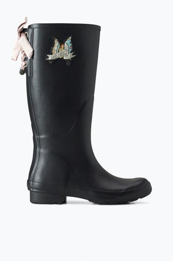 Odd Molly Tide -kumisaappaat. Reilu ja kätevä malli. Satiininauhanyöritys takana ja 3D-painatus ylhäällä varressa. Päällinen: paksua, kestävää kumia Vuori: kangasta Sisäpohja: irrotettava, pehmustettu, kangaspäällysteinen Ulkopohja: kokonaisena valettu kumipohja. Kuviollinen, pitävä kulutuspinta. Varren korkeus: n. 35 cm. Koron korkeus: n. 2 cm.