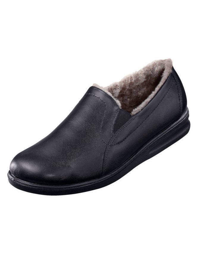 ROMIKA-sisäkengät, nahkaa. Jalkapöydän sivuilla joustavat venykkeet. Lammasturkisvuori. Sisäpohja osittain lammasturkista. Kuvioitu, joustava ulkopohja, jossa matala 30 mm kanta.