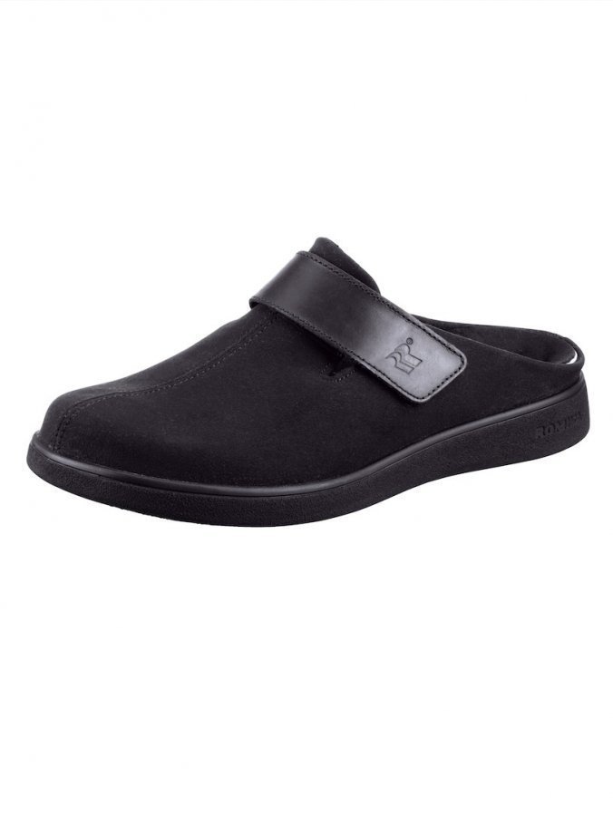 Romika-tohvelit. Pehmeää mokkajäljitelmää. Säädettävä tarrakiinnitys. Miellyttävä tekstiilivuori sekä irrotettava, pehmustettu sisäpohja (paksuus edessä 6,5 mm, takana 20 mm). Taipuisa ulkopohja. Lestin leveys H.