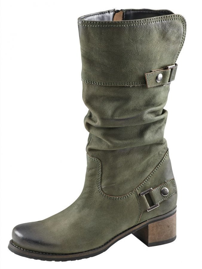 Saappaat, valmistettu martioidusta nahasta. Kuluneen näköiseksi käsitelty pinta. Koristesoljet, jotka on helppo kiinnittää painonapin avulla. Kätevä vetoketjusuljenta varren sisäsyrjässä. Vuori 95% polyesteriä, 5% tekokuitua. Miellyttävä nahkapohja. Taipuisa ulkopohja, jossa 50 mm:n korko. Lestin leveys G. Varren korkeus n. 30 cm. Koon 37 varren leveys n. 34 cm.