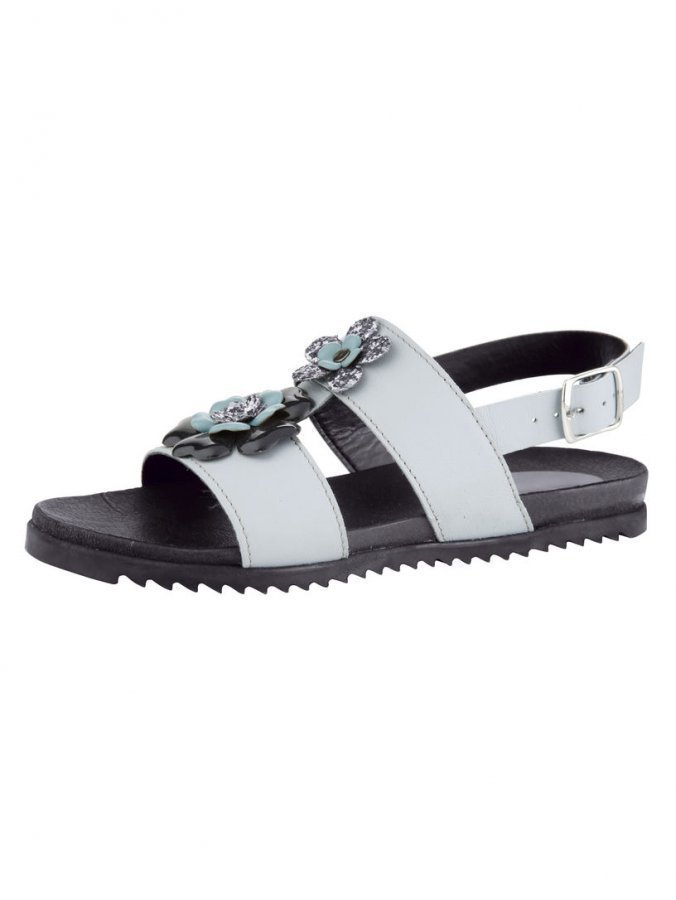 Laadukkaasta vuohennappanahasta valmistetut sandaalit. Viehättävät kukkasomisteet tuovat perusmalliin naisellisen vivahteen. Säädettävä kantaremmi pitää sandaalit hyvin jalassa. Miellyttävä nahkasisäpohja, tasapaksu 10 mm:n korokepohja. Lestin leveys G.