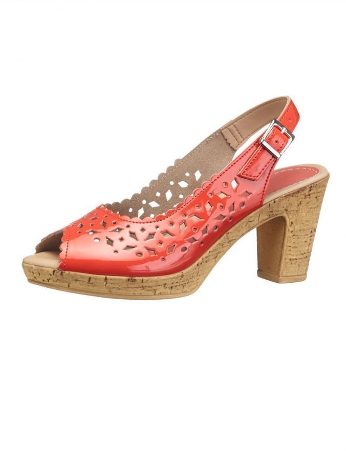 Tyylikkäät sandaletit, jotka on valmistettu kesäisesti rei´itetystä kiiltonahasta. Miellyttävästi istuvat, kannassa säädettävä kantaremmi. Nahkavuori ja pehmeä 1/2-nahkasisäpohja. 20 mm:n korokepohja ja 80 mm:n korko. Pohja ja korko korkkijäljitelmää. Lestin leveys G.