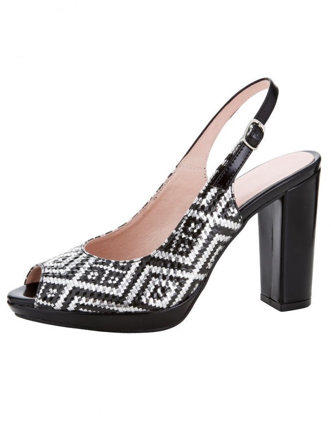 Näyttävät sandaletit. Kiiltonahkajäljitelmää. Muodikas kuosi ja väriyhdistelmä. Istuvat napakasti jalkaan säädettävän kantaremmin ansiosta. Miellyttävä nahkavuori ja -sisäpohja. Päällystetty 15 mm:n korokepohja ja 95 mm:n tolppakorko. Lestin leveys F.