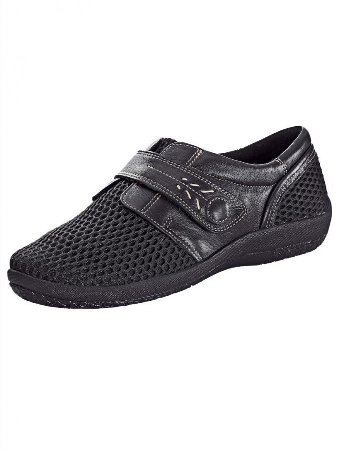 Tyylikkäät tarrakengät, joissa on joustavaa tekstiilimateriaalia ja kiiltonahkaa. Sopivat kipuherkille ja aroille jaloille. Tekstiilivuori ja irrotettava tekstiilisisäpohja, jossa on jalkaholvin tuki. Voidaan käyttää irtopohjallisten kanssa. (Paksuus edessä n. 3 mm, takana 6,5 mm.) Ulkopohja nousee kantapäästä ylöspäin, ja siinä on n. 30 mm:n kiilakanta. Lestin leveys H.