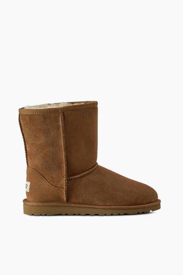 UGG Australia Kids classic -talvisaappaat ovat uskomattoman mukavat. Lämmin lampaankarvavuori kauttaaltaan. Lampaankarvavuori siirtää kosteutta ulospäin ja auttaa pitämään jalat mukavan kuivina ja lämpiminä kylmälläkin säällä. Varren reunassa kangasnauhaa. Paksu, mukavasti vaimentava ja kylmää eristävä pohja. Päällinen: mokkaa Vuori: lampaanvillaa Sisäpohja: lampaanvillaa Ulkopohja: karkeakuvioista kevyttä, vaimentavaa EVA-kumia Kun tilaat lapselle kenkiä, laske tämän verran kasvunvaraa: sandaalit/kävelykengät: 10–15 mm kengät/saappaat: 15–20 mm Kengän koko/sisämitta 22,5 = 149 mm 23,5 = 157 mm 24 = 165 mm 25 = 167 mm 26 = 172 mm 27 = 182 mm 28 = 186 mm 29 = 197 mm 30 = 202 mm 31 = 211 mm 32 = 218 mm 33 = 231 mm 34 = 236 mm Mittaa lapsen jalka näin: Laita lattialle A4-kokoinen paperiarkki, niin että paperin pääty on seinässä kiinni. Laita lapsi seisomaan paperin päälle, niin että kantapää koskettaa seinää. Lapsen jalkojen tulisi olla vierekkäin ja kehon painon jakaantua tasaisesti molemmille jaloille, ilman että lapsi nojaa mihinkään. Tee paperille merkintä jalan pisimmästä kohdasta (useimmiten isovarpaan kohdalta) ja mittaa mittanauhalla pituus paperin päädystä merkintään. Lapsen jalka kasvaa keskimäärin näin nopeasti: 1–2-vuotiaalla noin 20 mm vuodessa 2–3-vuotiaalla noin 15 mm vuodessa 3–11-vuotiaalla noin 10 mm vuodessa