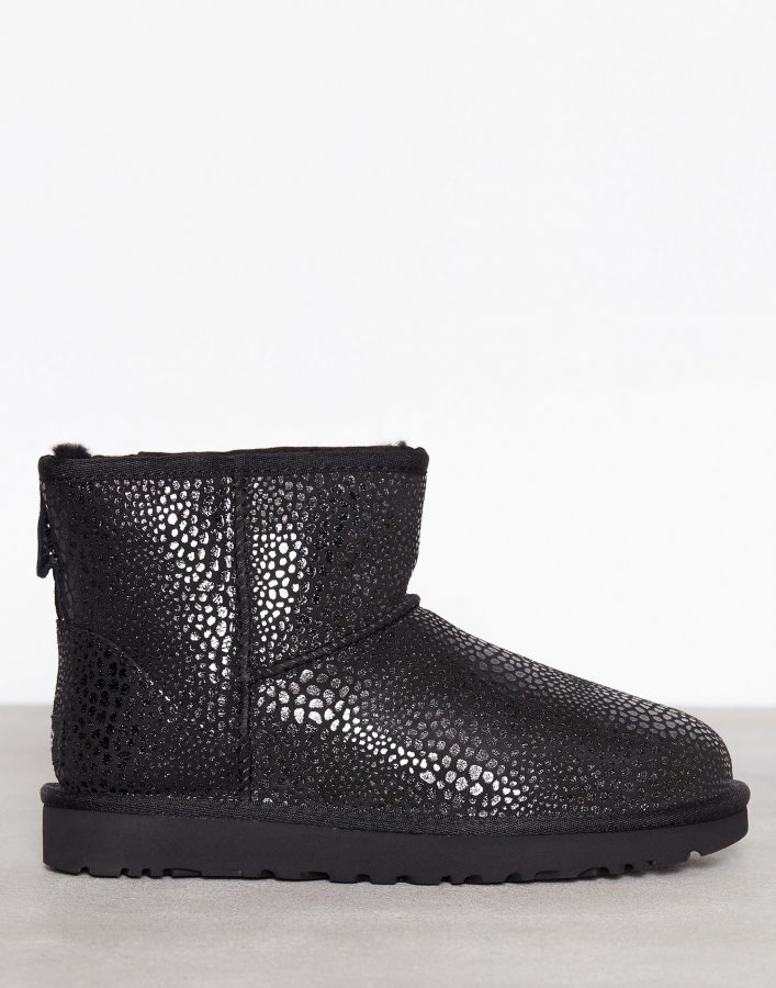 UGG bootsit aidosta mokkanahkasta. Pyöreä kärki ja matalampi varsi. printti kuvi ympärillä. Vahvistettu kärki kannassa. Vuorattu sisäpuoli phmeästä lampaanvillasta. Applikaatio logolla kannassa. Varsi 12, 5 cm. Valmistettu aidosta mokkanahkasta. Sisäpuoli villaa. Ulkopohja kumia. Tuotenumero: 138517-0014. Väri: Musta. Kategoriaryhmä: Kengät / Boots / Flat. Koot: 36, 37, 38, 39, 40, 41. Kohderyhmä: Naiset.