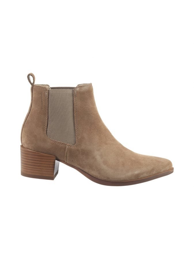 Tyylikkäissä mokkanahkanilkkureissa on terävä kärki ja paksu tolppakorko. Venykkeet varren molemmilla puolilla helpottavat pukemista. Koron korkeus on n. 5 cm.Päällinen on mokkanahkaa, sisäpuoli on tekstiiliä ja ulkopohja kumia.4110-140