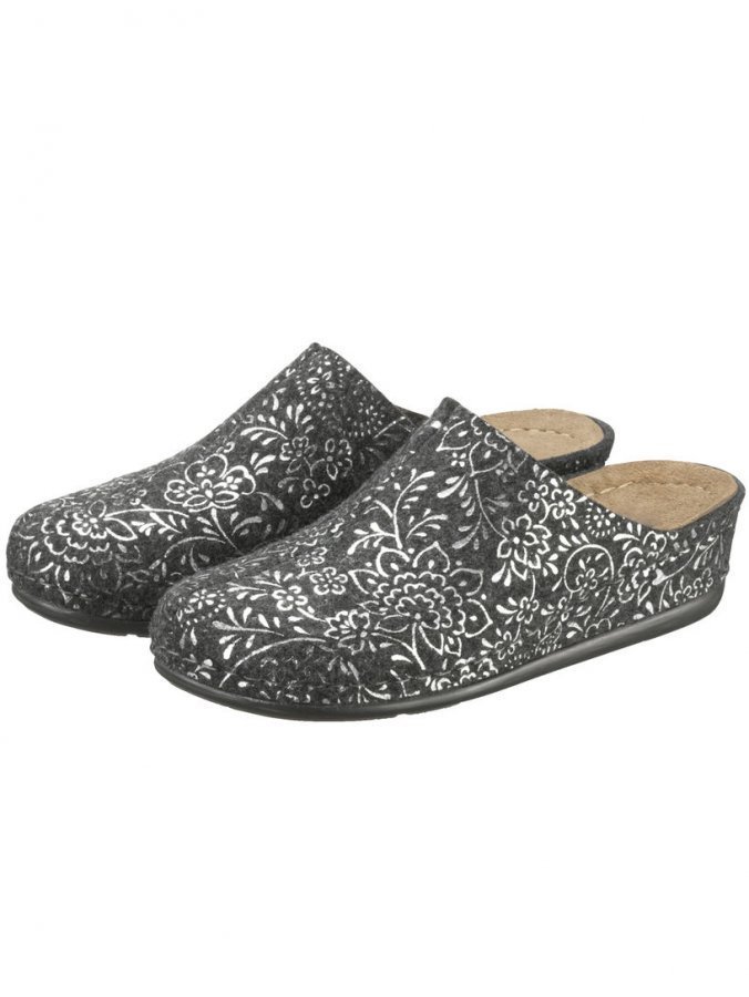 WALDLÄUFER-merkkiset tohvelit. Koristeellista kuvioitua, lämmintä villahuopaa. Vuorittomat. Pehmustettu nahkasisäpohja, jossa jalkaholvia tukeva muotoilu. 35 mm:n kiilakanta. Lestin leveys H.