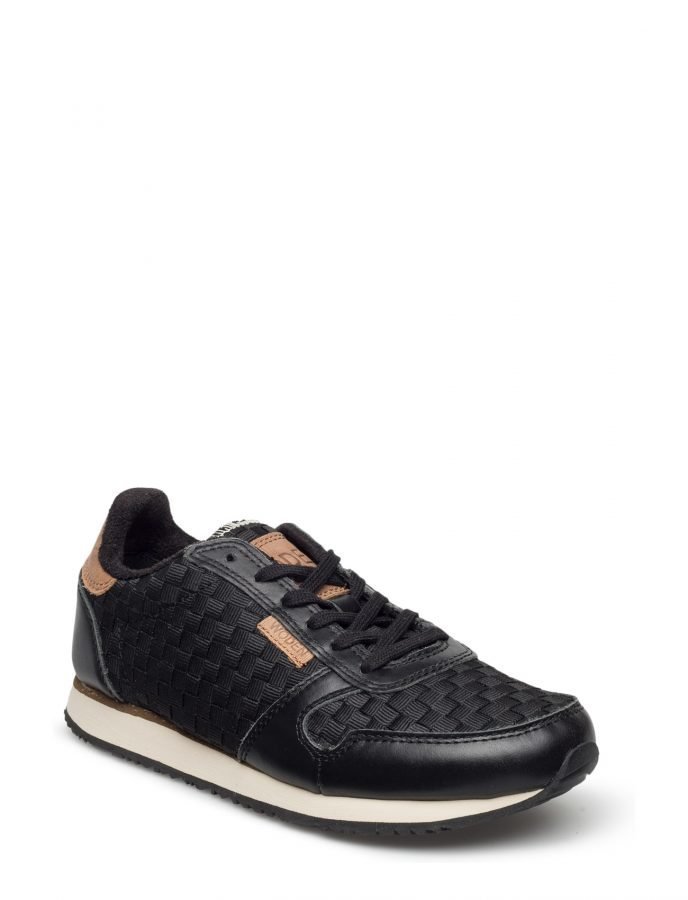 Woden Valmistusmateriaali: Päällinen: Nahka, Tekstiili Nauhakiinnitys Kudottu kuviointi Kevyesti topattu aukko sekä läppä Komposiittipohja hyvällä